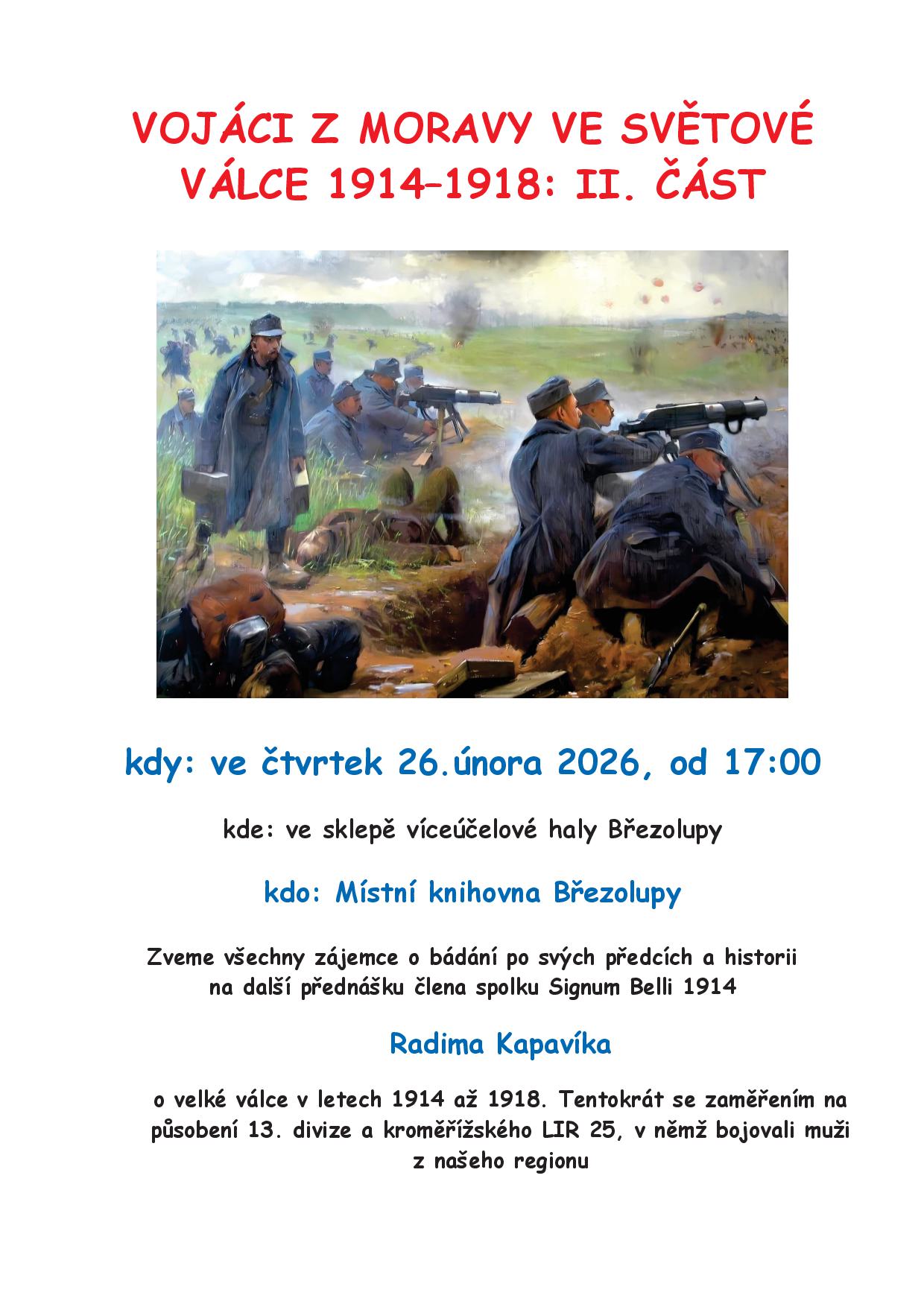 VE ČTVRTEK 26.3.2026 PROBĚHNE ZAJÍMAVÁ BESEDA O LEGIONÁŘÍCH ZA 1.SVĚTOVÉ VÁLKY..